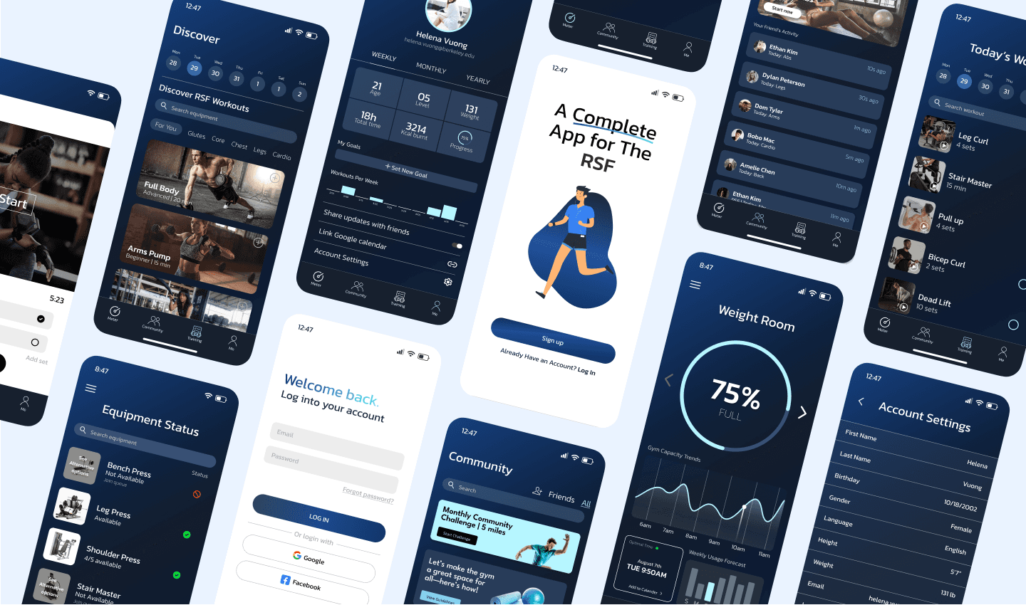 A user-friendly gym app designed to enhance the overall experience for students at the RSF. The goal is to help students navigate weight room crowding by providing real-time updates on wait times and offers tailored workout plans to boost confidence and efficiency. By addressing these key pain points, the app aims to create a more accessible and enjoyable gym environment for all students.