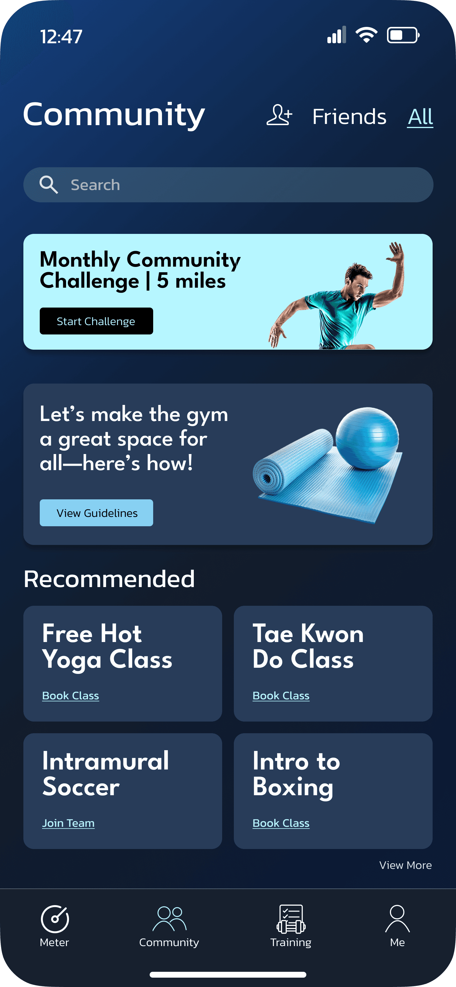 The community page helps students discover classes and group activities, fostering a more positive and connected gym environment.