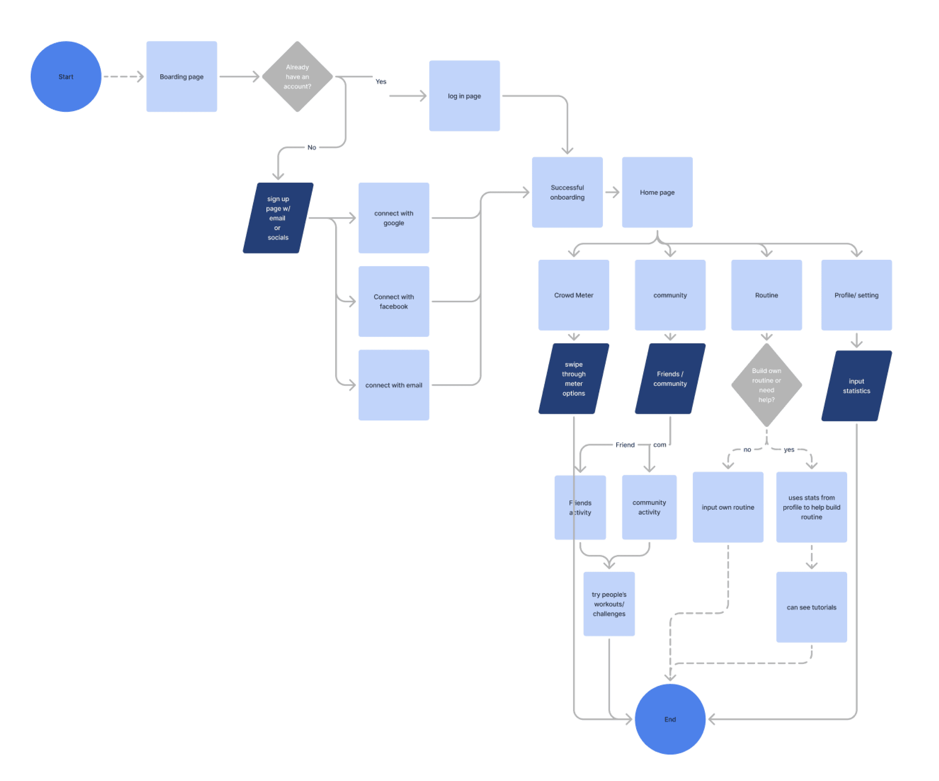 I created a user flow map to better understand and define architecture of the app. I wanted to make sure the app felt easy and intuitive. This also helped me recognize edge cases that I would not have before.